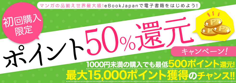 ebookJapanでは、初回購入限定で50%ポイント還元を行っています!